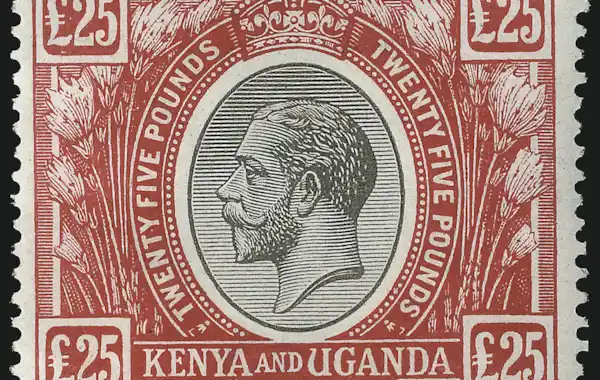 The crisp, beautiful Kenya and Uganda red and black stamp shown below was expensive the moment it left the printers in the 1920s, with a denomination of £25, and almost a century later it sold for over 1,000 times its original value.