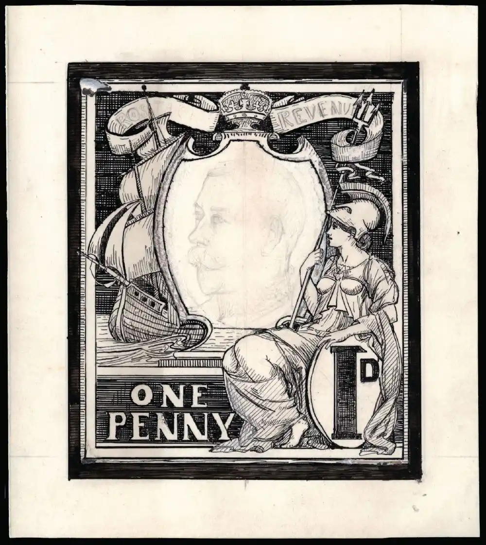Having artwork for a stamp design is a fantastic way to tell the story of a stamp's creation, and this is a great example, showing artist Bertram Mackennal's 'large pen and ink' essay. The item, offered by Stanley Gibbons for £2,950, shows Britannia and a galleon in the design and the central vignette with a rough pencil sketch of a three quarter face similar to the Downey head stamp design. According to the stamp dealers the design was rejected 'as it did not include a "Lion Couchant" as directed'. Apparently this gem was discovered in Mackennal's estate after his death.