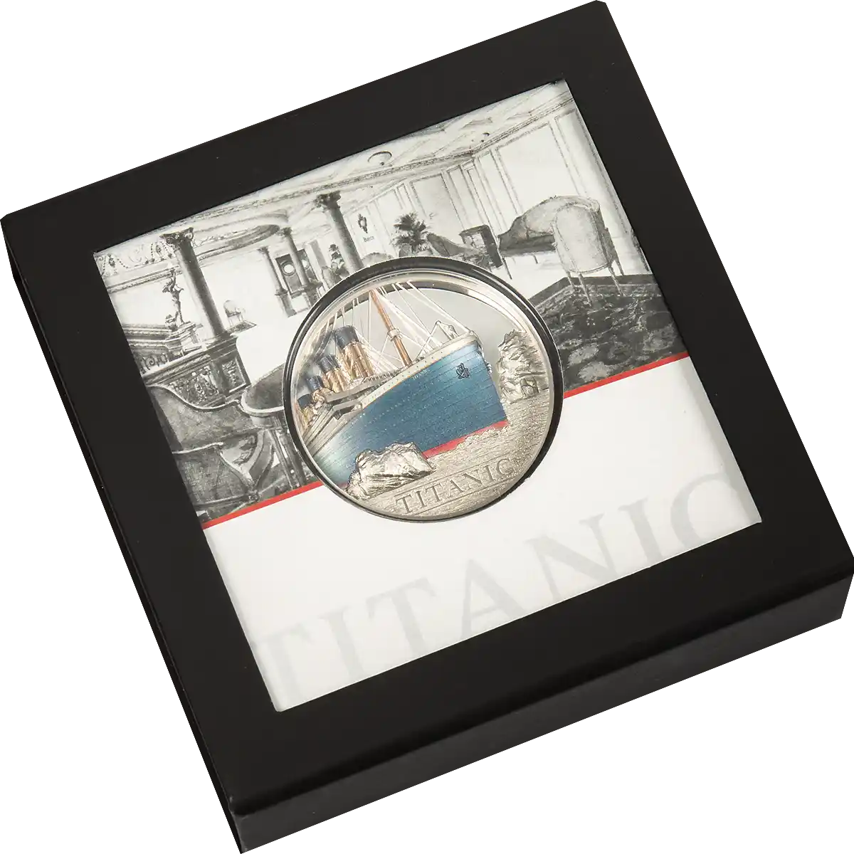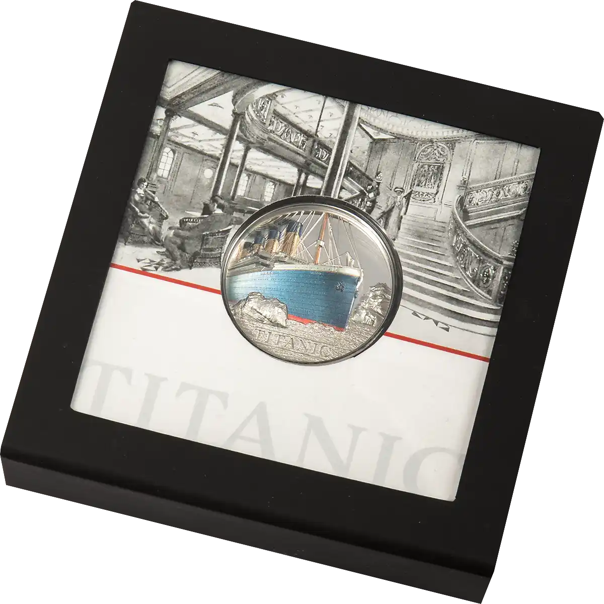 If you want to own a piece of the Titanic yourself, you may do so by purchasing one of the two silver coins or the one-oz gold coin, which feature an inlay of original coal within the elevation of the ship, placed at the exact spot where the coal was stored in the Titanic.