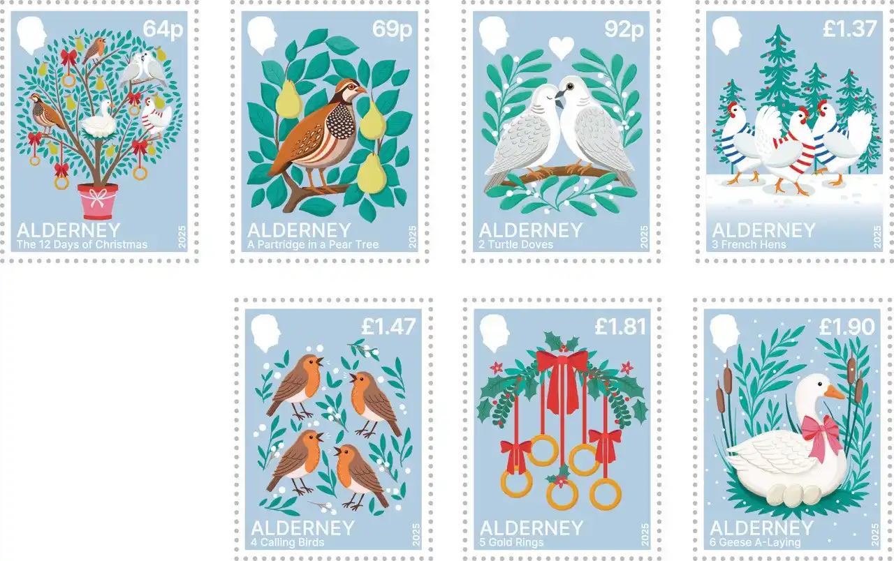 “The Twelve Days of Christmas is such a joyful carol, and we’re delighted to see it brought to life across this year’s stamps. Together, the Guernsey and Alderney stamps provide a complete visual interpretation of this timeless carol, offering collectors and senders a festive series that spans all 12 verses. We hope they will bring a touch of Christmas magic to the cards and letters sent around the world this season.”