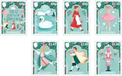 Meanwhile, Guernsey’s stamps complete the story, illustrating verses seven through to 12. The designs feature dancers, a swan, milkmaid and a drummer, with each stamp sharing a festive background of seasonal greenery and soft winter tones.