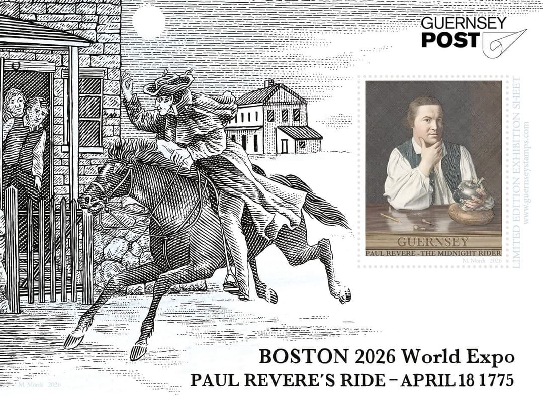 Guernsey Post’s philatelic bureau announces the release of a limited-edition Cinderella miniature sheet celebrating Paul Revere, the Boston patriot and silversmith whose midnight ride became one of the defining moments of the American Revolution. The special sheet will be unveiled at the Boston 2026 World Stamp Show, the twelfth international philatelic exhibition of the United States, taking place 23-30 May, at the Boston Convention & Exhibition Center.
