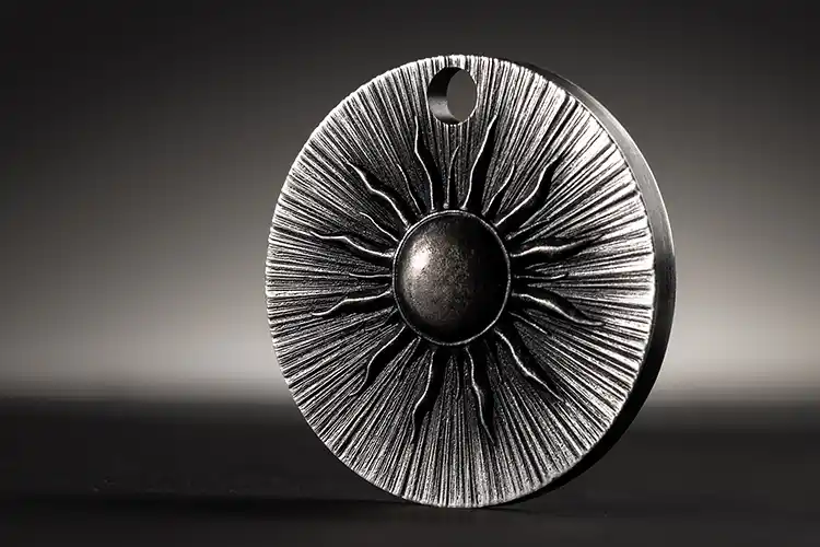 The obverse features a radiant sun with pulsating energy, while the reverse shows a minimalist crescent moon, representing harmony between light and shadow. A unique edge opening allows the coin to be worn as a personal amulet.