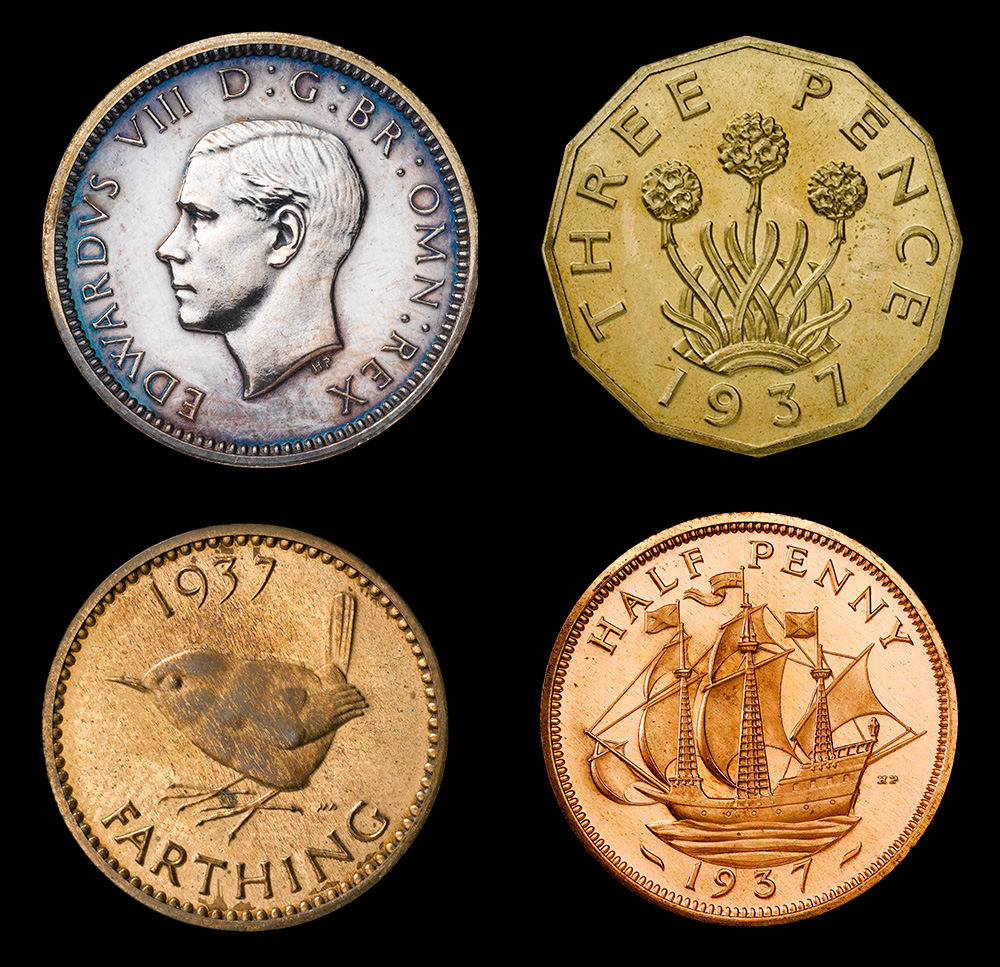Above: Four of a series of Edward VIII coin pattern designs made before the King abdicated, 1937 (The Royal Mint Museum)