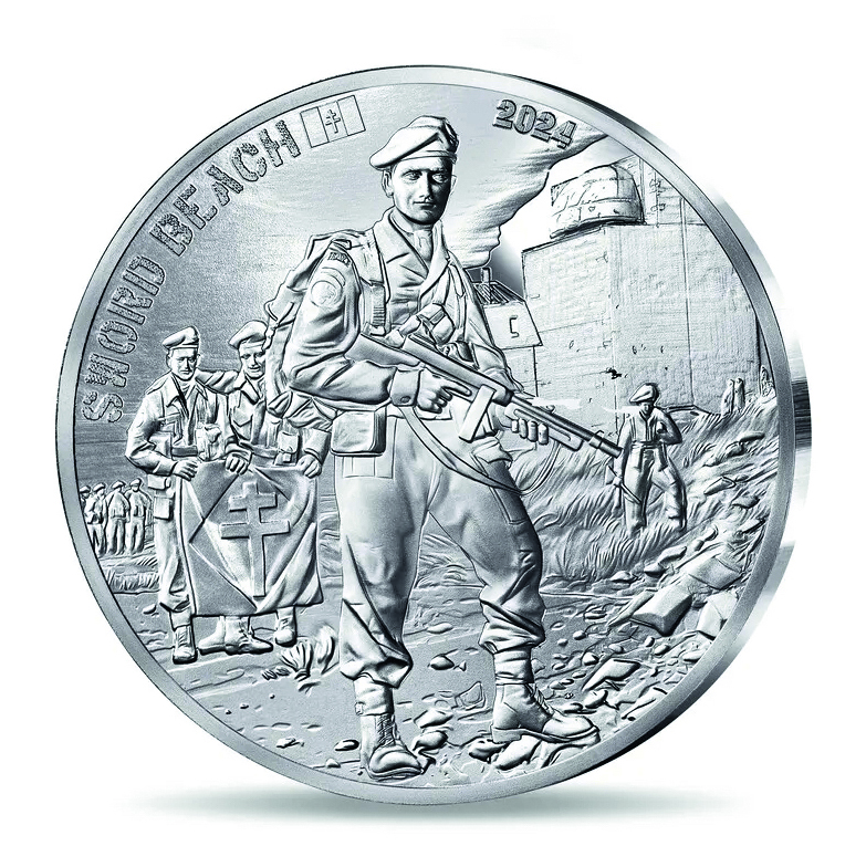 Léon, a Second Maitre (Petty Officer) of the Commando Kieffer, was 1 of the 177 Frenchmen who took part in the Normandy landings, on what is known as Sword Beach, alongside British forces as part of Commando No. 4 is featured on one of the coins. Depicted on the coin, he poses in front of 1 of the Ouisreham bunkers. His comrades are shown in the background holding the flag of the Free French Naval Forces.