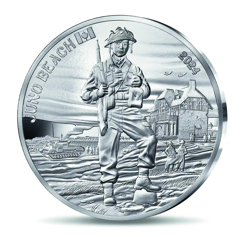 The fourth and final coin shows Fred, a lieutenant with the Royal Winnipeg Rifles, was a member of the 3rd Canadian Infantry Division and landed on Juno Beach. Fred can be seen in front of the beach, where there is a Churchill AVRE tank, 2 soldiers from his unit hold the Canadian flag of the time and a traditional house from the Côte de Nacre landscape is also depicted.
