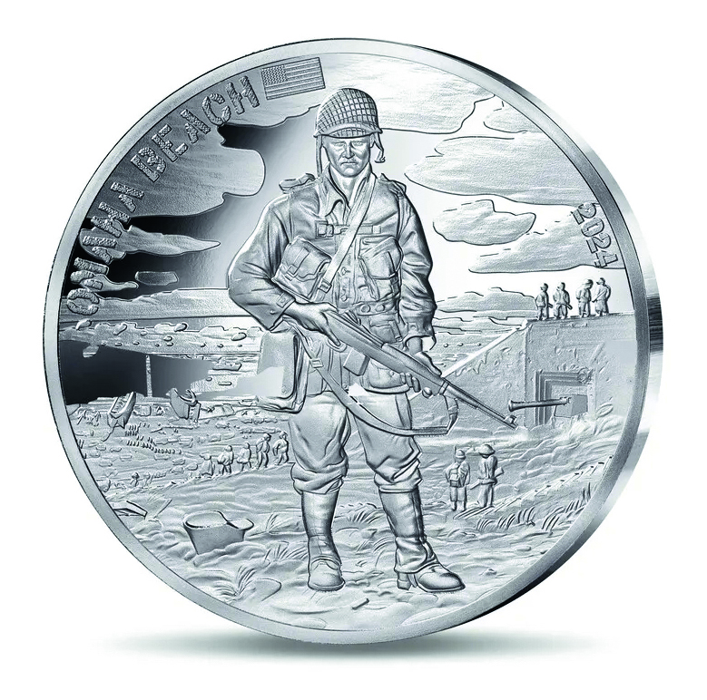 The third coin shows American officer James, a member of the 1st infantry division who landed on Omaha Beach. He is shown in front of the beach at the end of the day, the background shows bunkers and numerous barges and ships offshore that provided support for the beachhead.