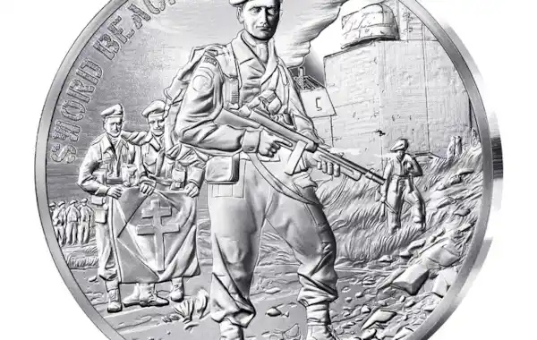 Léon, a Second Maitre (Petty Officer) of the Commando Kieffer, was 1 of the 177 Frenchmen who took part in the Normandy landings, on what is known as Sword Beach, alongside British forces as part of Commando No. 4 is featured on one of the coins. Depicted on the coin, he poses in front of 1 of the Ouisreham bunkers. His comrades are shown in the background holding the flag of the Free French Naval Forces.