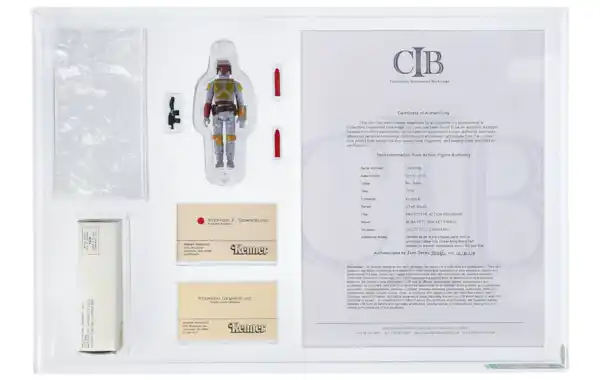 There are around 26 examples of the J-slot Boba Fett prototype known to collectors and most bear the scars of the quality control tests. Unlike the other Rocket-Firing Boba Gett specimens on the market, this J-Slot (V2) is the Mailer version and this J-Slot V2/2 Missile sold is one of just three examples in existence, with this specimen the highest-graded example of the three. This is also the first time a Mailer J-slot V2/ Missile example has come up for auction, making it a once in a lifetime opportunity for collectors. The Mailer version has a box, is painted and rests inside an archival case, with 2 missiles and a blaster. The original Maple Plain Company box and plastic wrap are secured in the display and appear as they would if mailed to a collector in 1979. Also included is two Kenner business cards and a certificate of authenticity from Collectible Investment Brokerage, which attests to the authenticity of this extremely rare collectible figure.