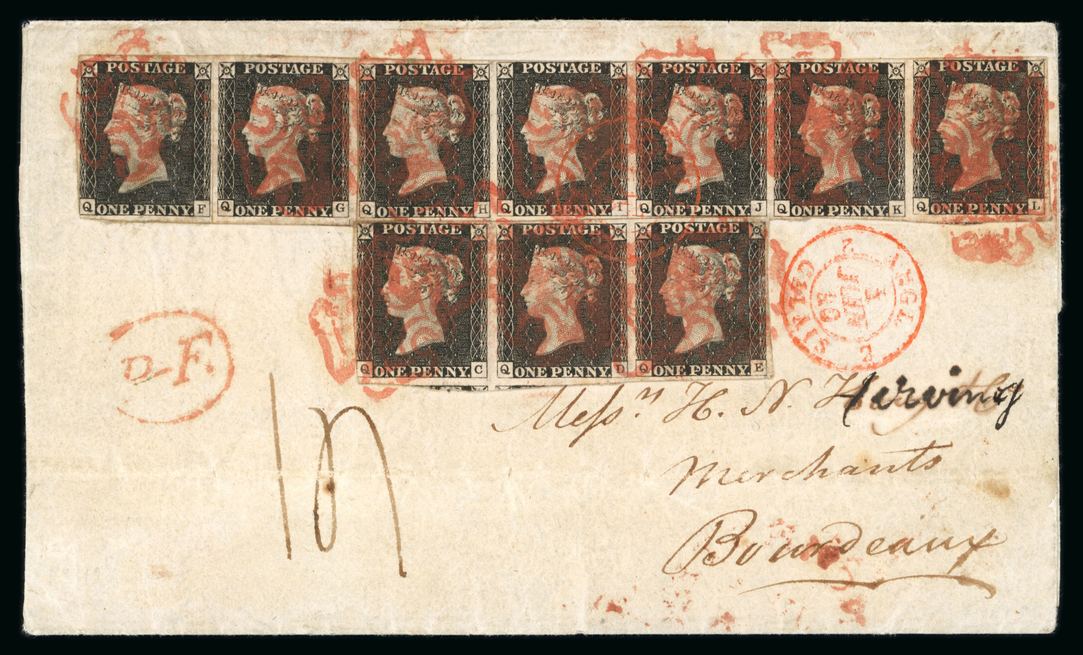 The auction taking place on Thursday 20th June will focus on Great British stamps. Highlights from this section include a mint horizontal block of 12 1840 1d black from place 7 (FA-GF) on experimental thin paper (lot 50225). This lot has a full margin on the left, shows part of an inscription which reads ‘Back be careful not to remove the Cem’ and has an estimate of £200,000-£300,000. Another standout lot from the GB stamps section is an entire letter sent from Manchester to Bordeaux on 1st June 1840. The letter features a strip of 3 1840 1d black (plate 2), 2 singles and a strip of 5 (lot 50155). It is neatly cancelled and tied by red Maltese Crosses and additionally cancelled by a French arrival circular destamp in red. The internal letter reads ‘this letter is a specimen of our new postage act’ and is an extremely rare overseas destination cover.