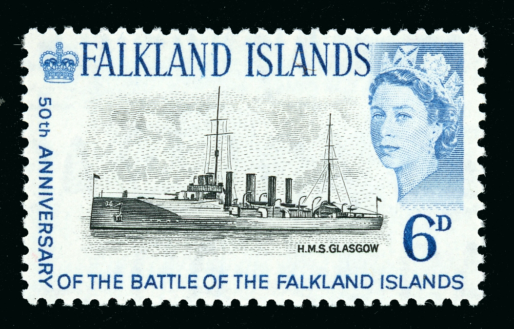 Above: One of only 17 errors of this black and light blue Battle of the Falkland 6d stamp is available to purchase at David Feldman's Spring Auction Series