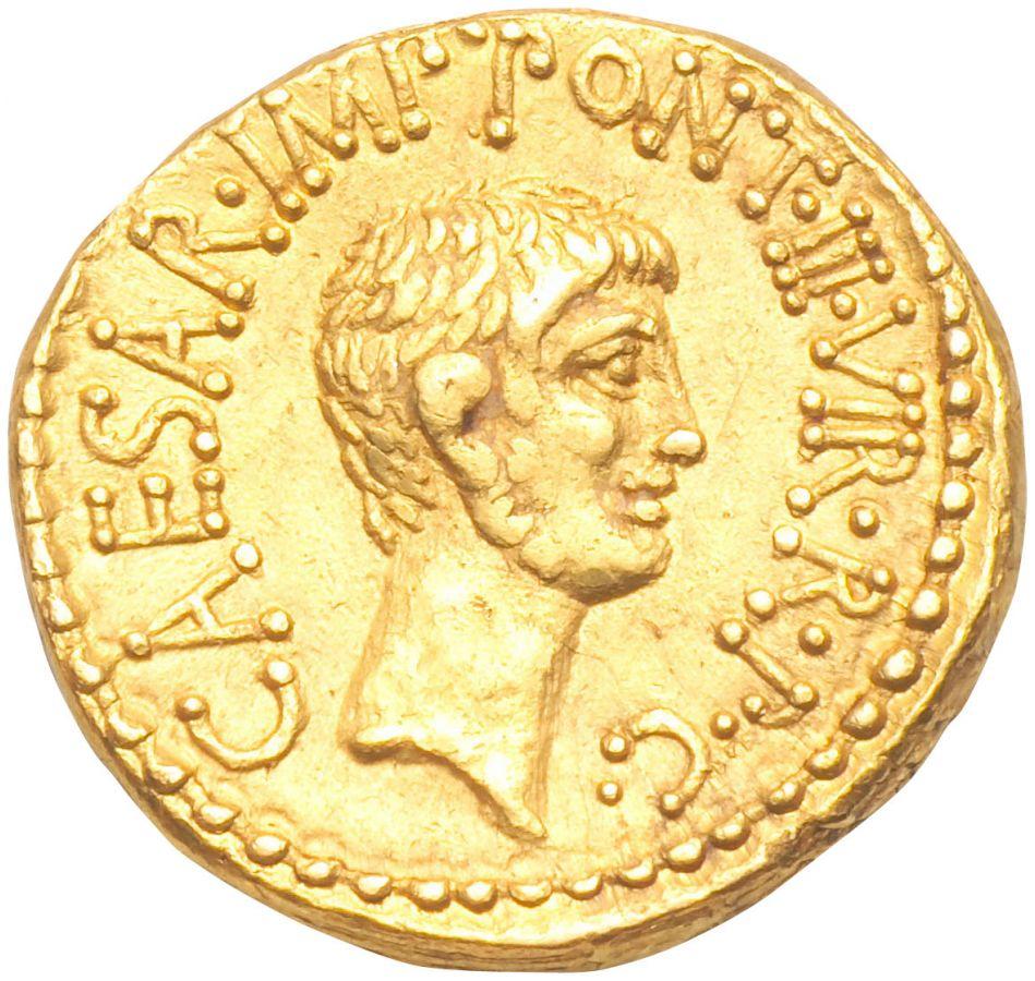 It was Mark Antony, a general who served under Caesar, that righted the wrongs of Brutus and melted down the famous EID MAR coin. He joined forces with Marcus Lepidus and Octavian (also known as Augustus) to rule the Roman Republic. Antony and Octavian are the subjects of our second Roman rarity.
