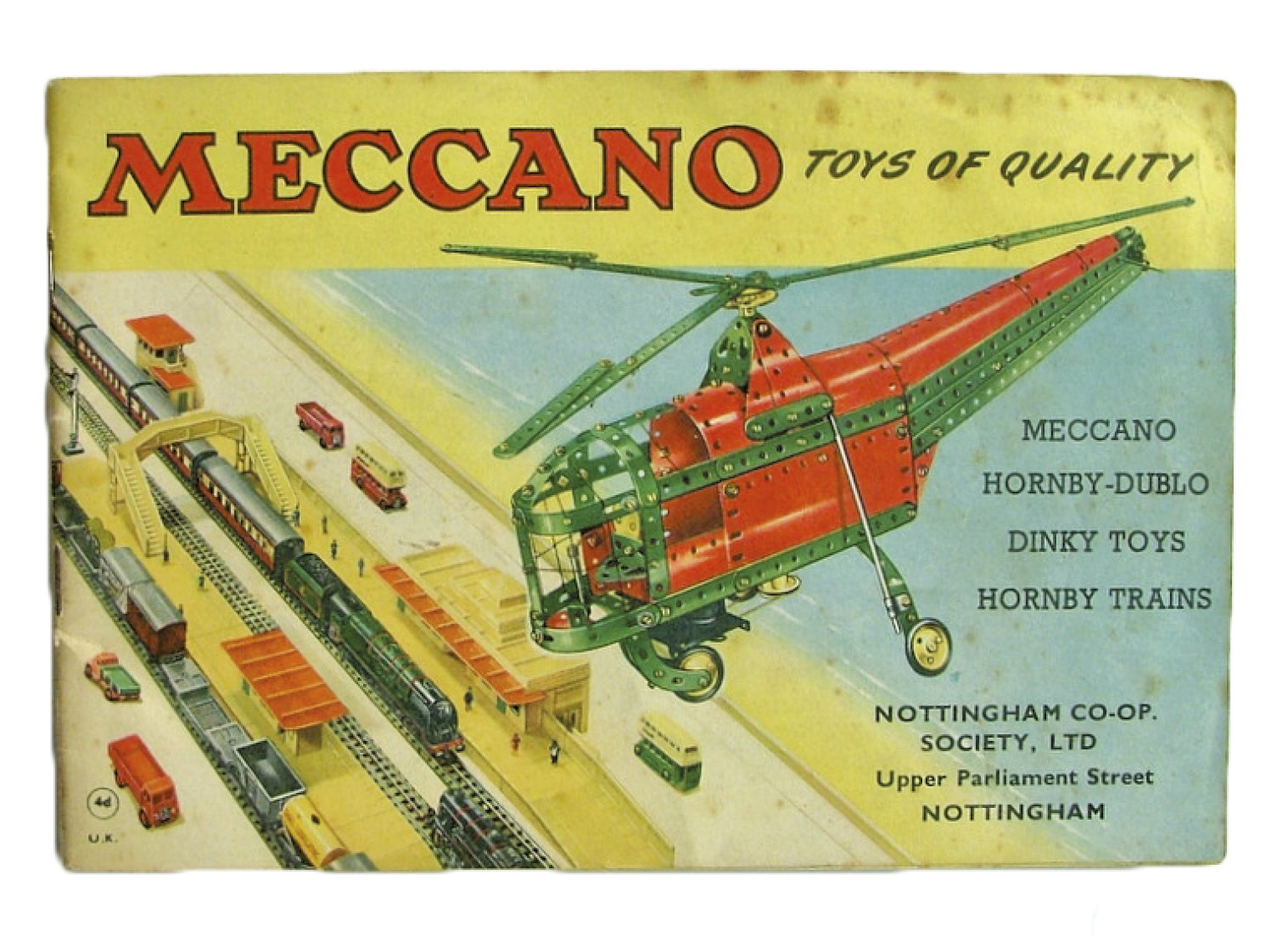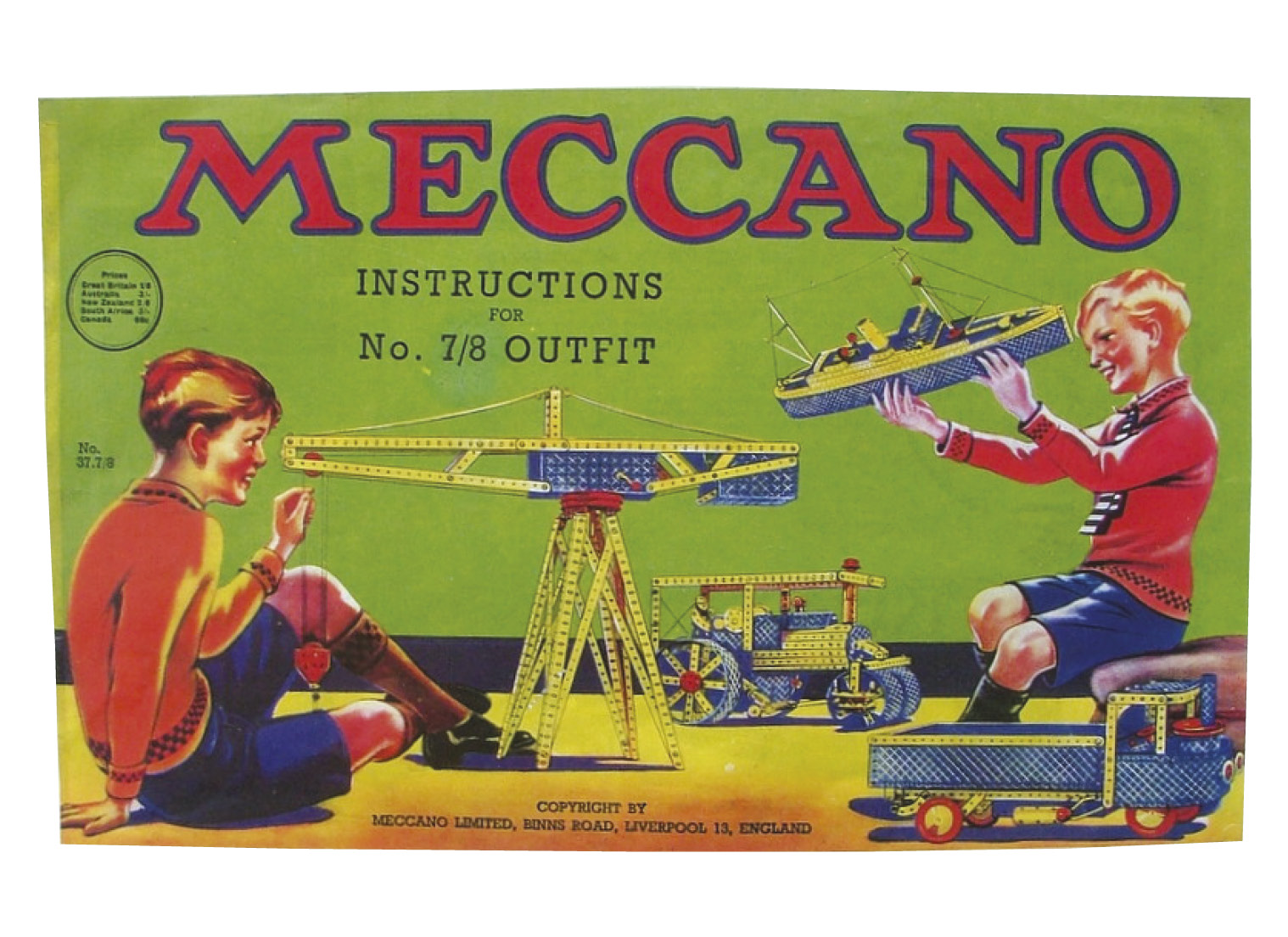 When Frank Hornby got home from his job as a book-keeper at Liverpool docks he found relaxation in his small workshop making toys from scrap materials for his two young sons, Douglas and Rowland. Born in 1863 Hornby had grown up with a great love of trains and it was while making a railway journey in the late 1890s that he first conceived the idea of creating a constructional toy comprised of small regulated strips of metal with holes that could be bolted together simply with a spanner and a screwdriver. His aim was to build railway bridges and cranes like the ones operating at the docks where he worked. He developed the idea further, making models for his boys to play with. Hornby saw great potential in this toy and, excited by its educational value, borrowed £5 to register a patent for it on 30th November, 1901. With financial support from his employer, David Hugh Elliott, Hornby found a factory willing to make the toy that he called ‘Mechanics Made Easy.’ The first set contained fifteen or so individual parts, which were sold in a small lithographed tin with a picture of a crane on one side and and a train crossing a bridge on the other. Initial interest was slow but Hornby maintained a resolute determination to succeed. Slowly but surely the popularity of the toy increased, aided by the launch of model building competitions which, by 1904, were attracting some interesting entries. The success of Meccano led Frank Hornby to give up his day job and concentrate entirely on his new venture in 1906. One of the first things Hornby modified was the name. He came up with the name Meccano which was adopted and registered in 1907 largely because ‘Mechanics Made Easy’ sounded too long and cumbersome for the new look boxes and advertising literature. Esperanto sounding, it was a name ideally suited to the expanding international market Hornby was aiming at. There is a line of thought held by some historians, however, that this catchy name was derived to reflect the words ‘Make and know’.