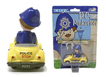 In the TV show, P.C. Bob usually rode a bike, but occasionally used a patrol car. His car was a white hatchback with blue and yellow checks, unlike Ertl’s yellow convertible, although an enclosed car is not really suitable for oversized character figures. The model was packaged on a large blister card with a big picture of P.C. Pinkerton outside a police station.