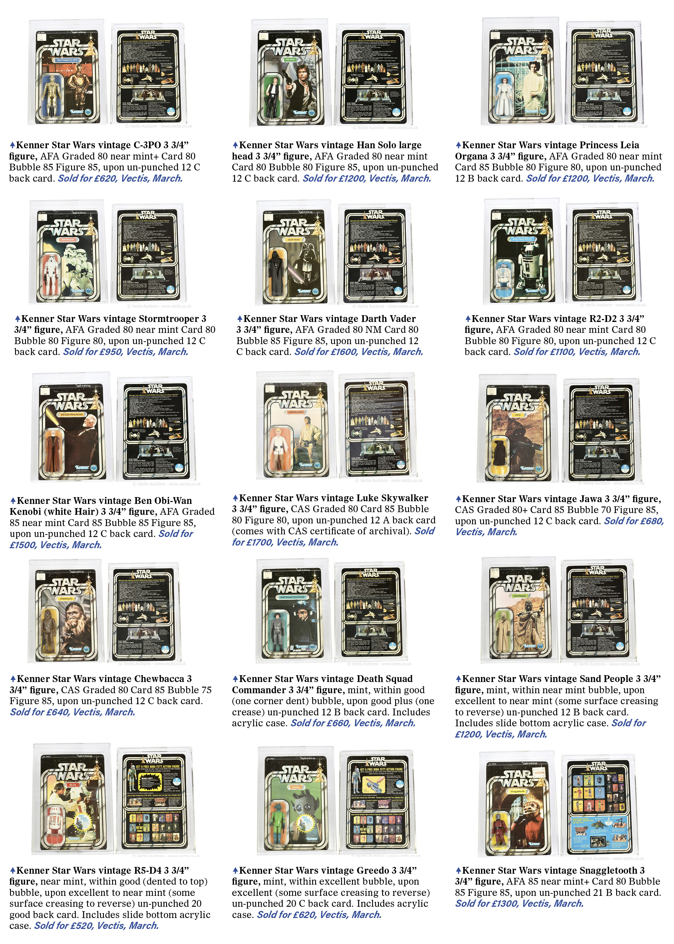 Kenner Star Wars vintage Luke Skywalker 3 3/4" figure, CAS Graded 80 Card 85 Bubble 80 Figure 80, upon un-punched 12 A back card (comes with CAS certificate of archival). Sold for £1700, Vectis, March.