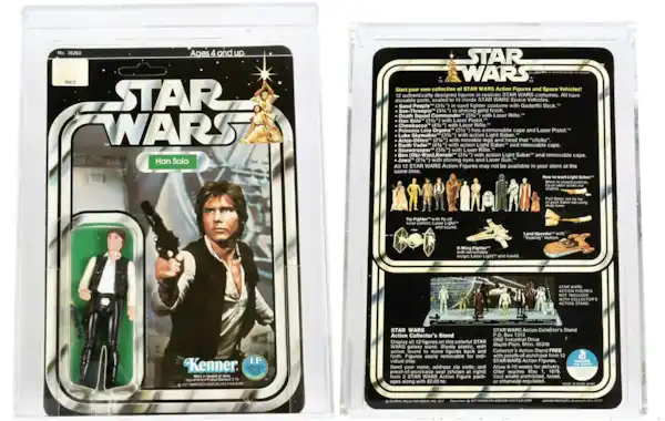 Kenner Star Wars vintage Han Solo LARGE HEAD 3 3/4" figure, AFA Graded 80 NM Card 80 Bubble 80 Figure 85, upon un-punched 12 C back card. Sold for £1200, Vectis, March.