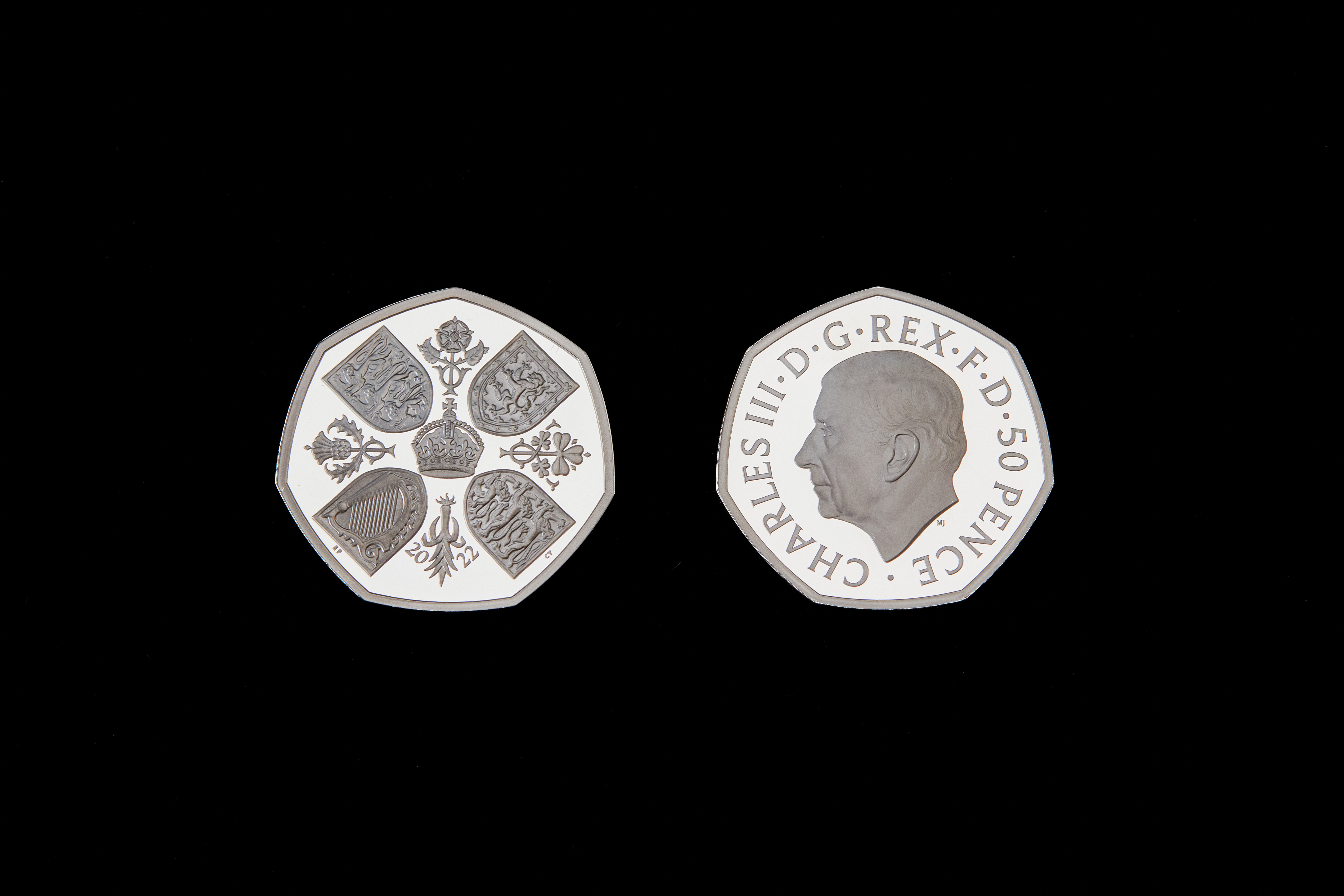 The reverse of the 50p coin features a design that originally appeared on the 1953 Coronation Crown, which was struck to commemorate Queen Elizabeth II’s coronation at Westminster Abbey, and includes the four quarters of the Royal Arms depicted within a shield.