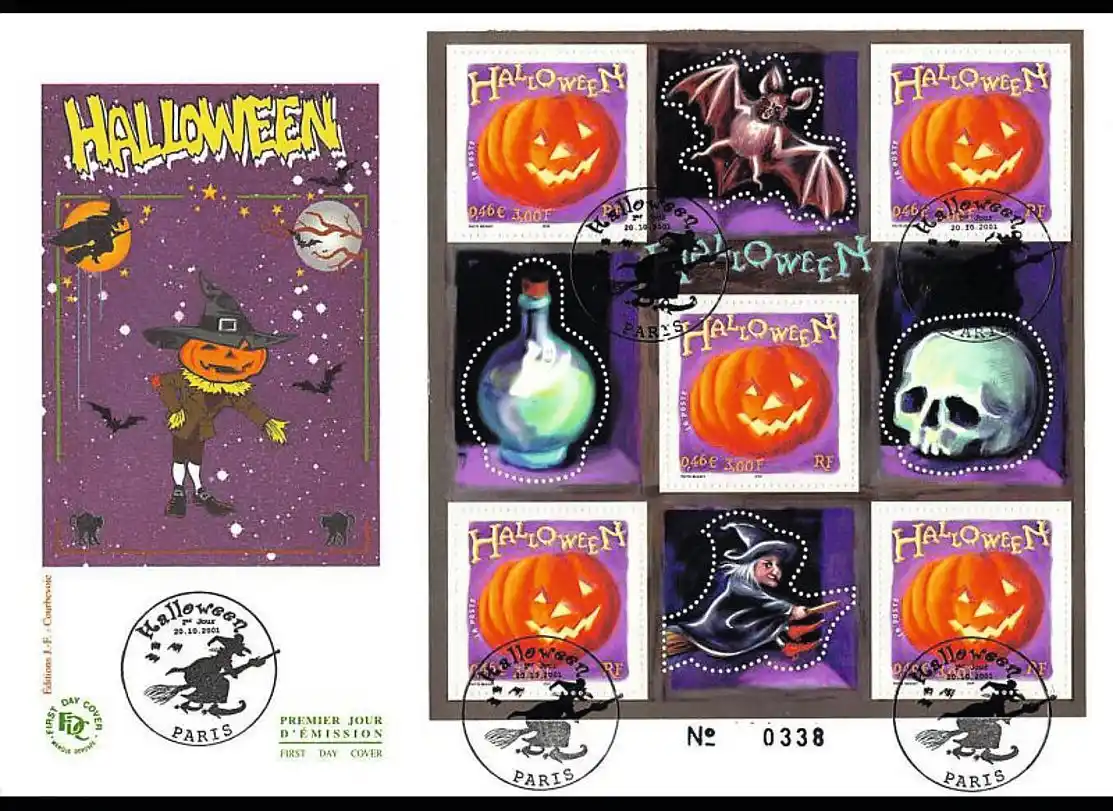 The first Halloween issue from La Poste was issued on 20 October 2001. It had a dual 3f and 46c denomination and was issued in sheets of 30 as well as in small sheetlets of five.