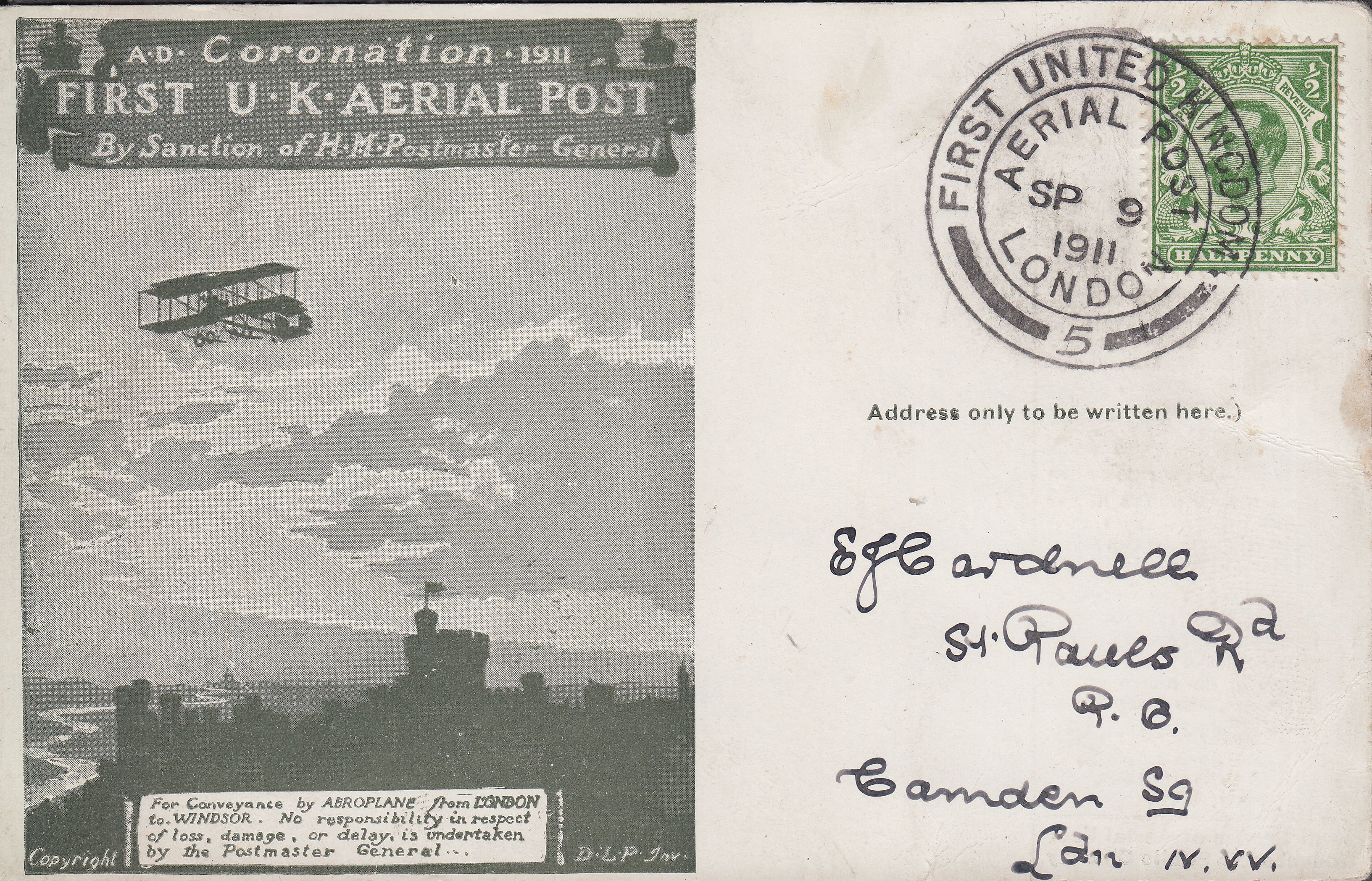 Postal history dealer and expert Bill Barrell recently offered a lovely set of six covers for £1,250, each with a different London postmark, and 'cancelled with mostly superb strikes' of the 'FIRST UNITED KINGDOM/AERIAL POST LONDON' die 5 hand stamp, for the six different days of this event. The covers were all addressed to one 'SJ Cardnell' who happened to be a Postal Clerk at Hendon Airport responsible for franking mail for the flights, no wonder it the set was described as 'a superb souvenir of the event'.