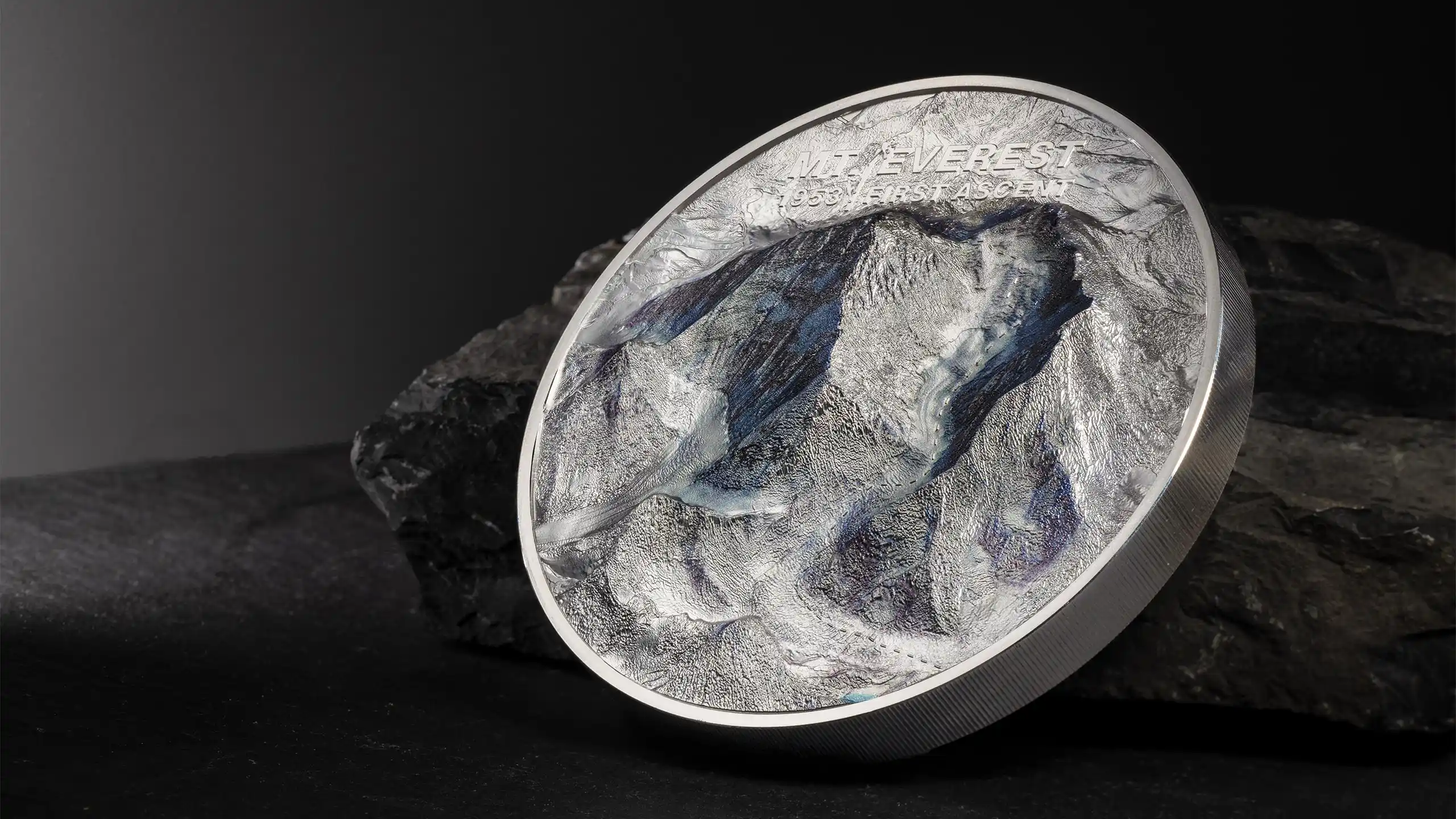 This spectacular coin from CIT recalls the first ascent of the world's highest mountain, using ultra high relief to show the peaks of Everest.