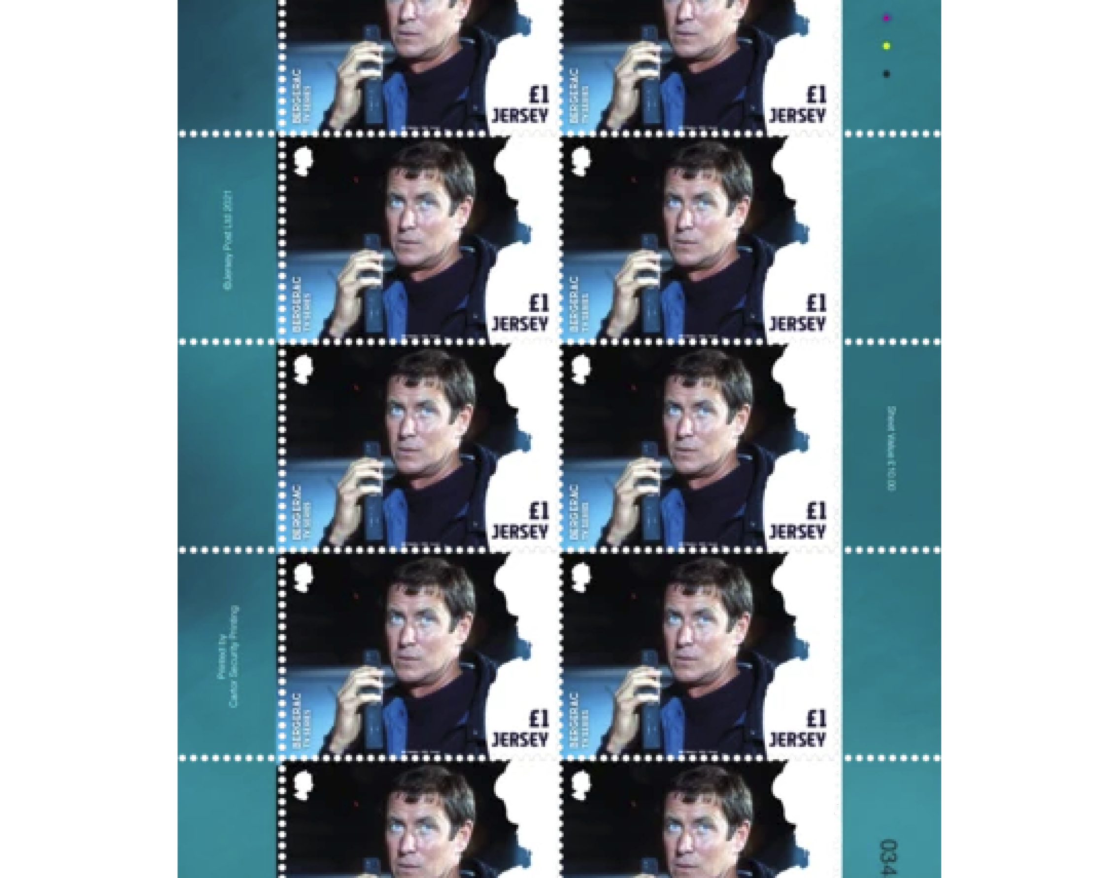 ‘Bergerac is a classic TV series that brought the Island of Jersey to the attention of the rest of the world, enjoyed today for its nostalgic glimpse of the 1980s. The stamps show a selection of scenes and characters from various episodes, each featuring sections of the Island’s coastline in a style reminiscent of a TV show opening title sequence.