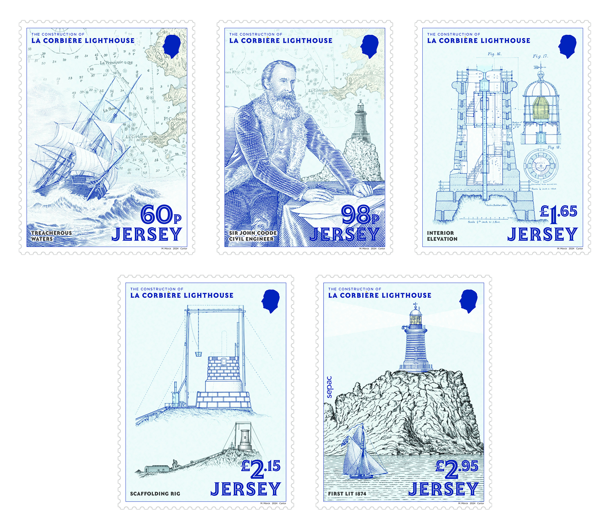 The artwork featured on the stamps has been created by Norwegian engraver Martin Mörck, whose illustrations were inspired by original plans and designs of the first working drawings of La Corbière Lighthouse.