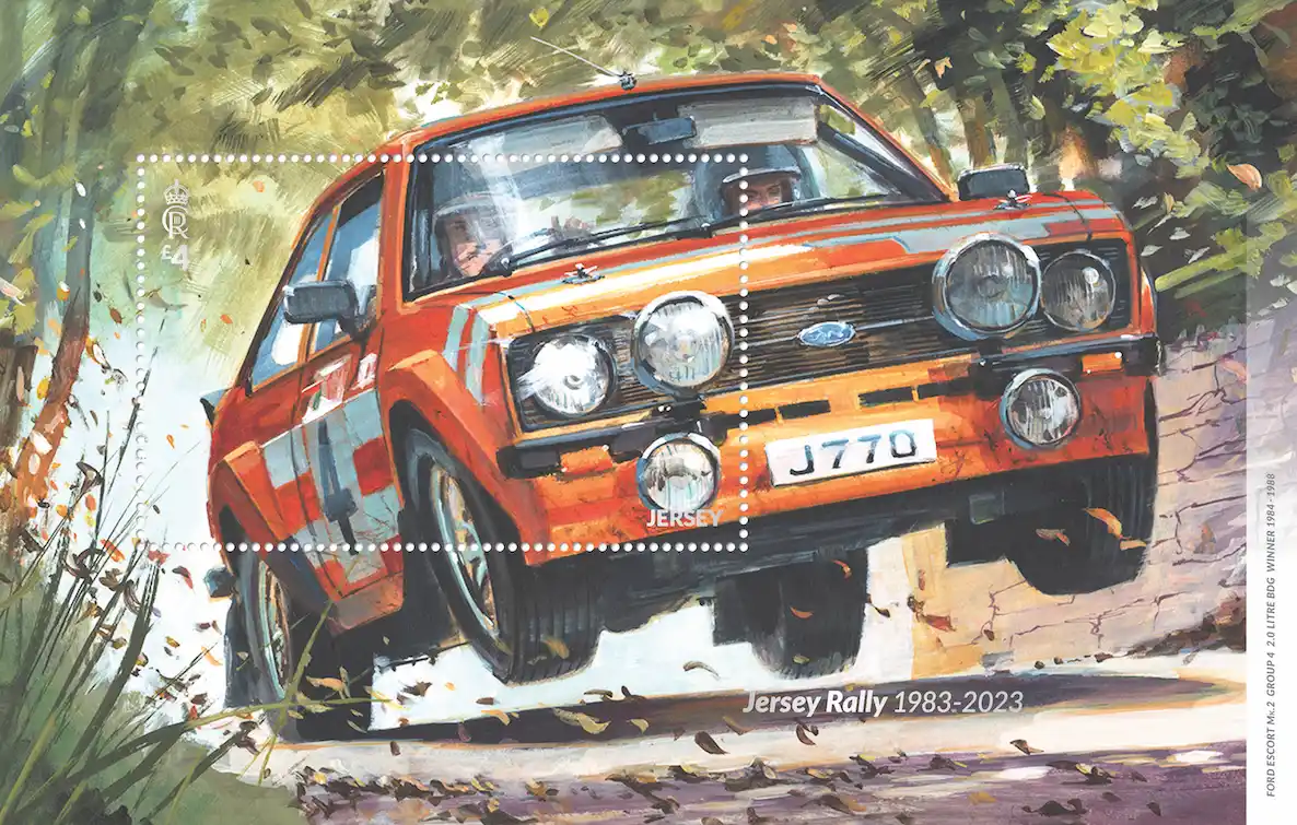 The miniature sheet depicts the orange Ford Escort Mk. 2 driven by Dave Carrel, who in 1984 became the first Jerseyman to win the Jersey Rally, continuing with wins in ’85 ’86 ’87 and 1988.