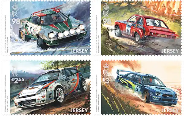 Eight new stamps and a miniature sheet from Jersey Post depict famous moments in World Rally Championship and Jersey Rally history in a new set