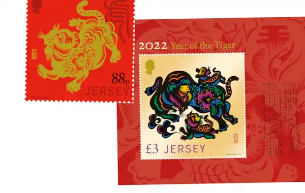 The seventh issue in Jersey Post’s Lunar New Year series celebrates the Year of the Tiger and comprises a single stamp and a miniature sheet designed by renowned Chinese artist Wang Huming.