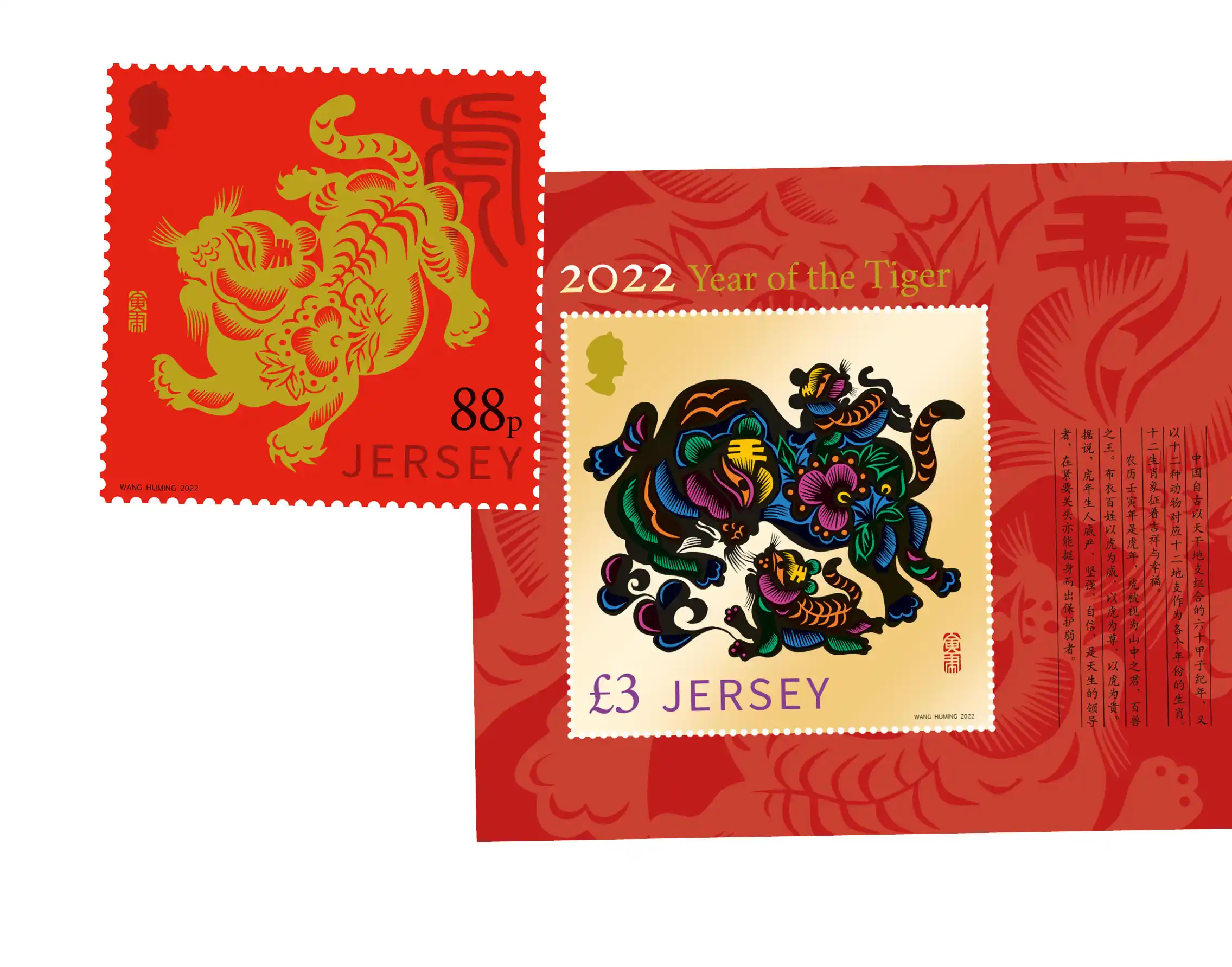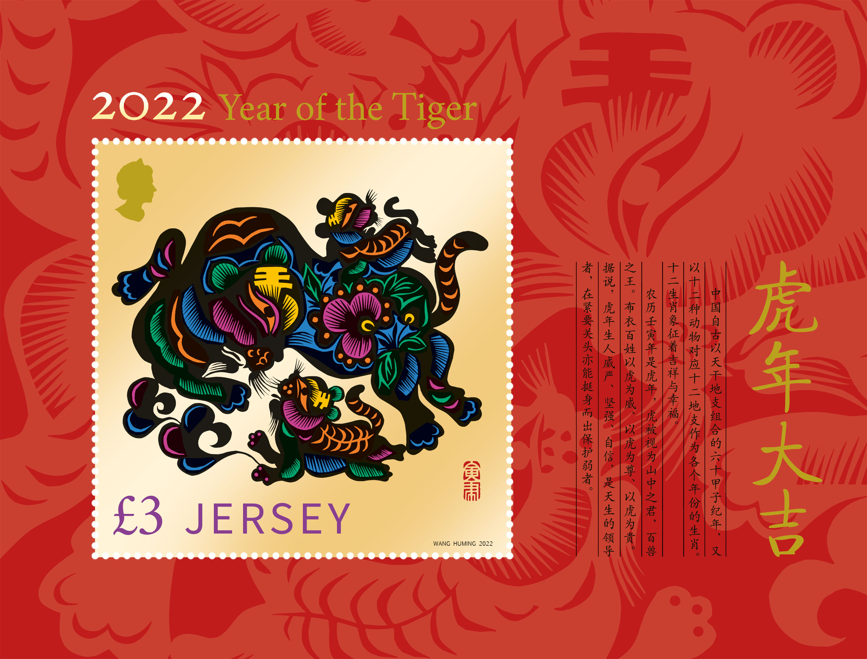 The seventh issue in Jersey Post’s Lunar New Year series celebrates the Year of the Tiger and comprises a single stamp and a miniature sheet designed by renowned Chinese artist Wang Huming.