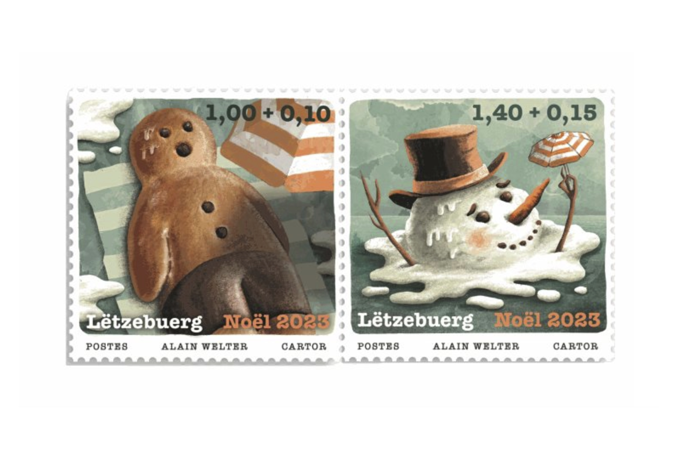The designs of Luxembourg's Christmas 2023 stamps are surprising to say the least: a melting snowman and a sweating Boxemännchen.