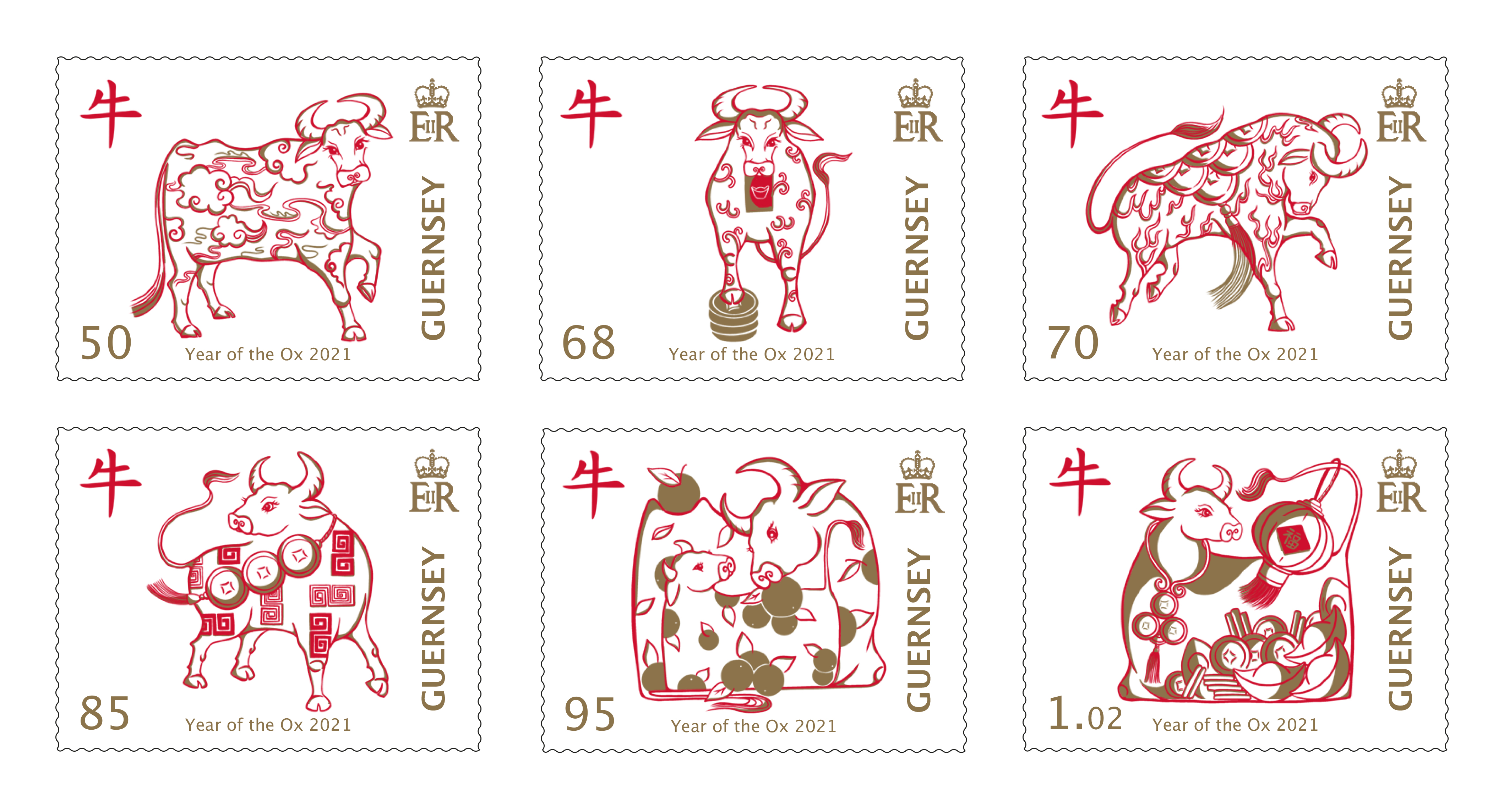 For the Ox set, artist Chrissy Lau, who has worked on Guernsey’s entire Chinese New Year series, has taken inspiration from the patterns found on Feng Shui ornaments, as, in China, it is common practice in China to display Feng Shui animal ornaments depicting coins and gold to attract good fortune.
